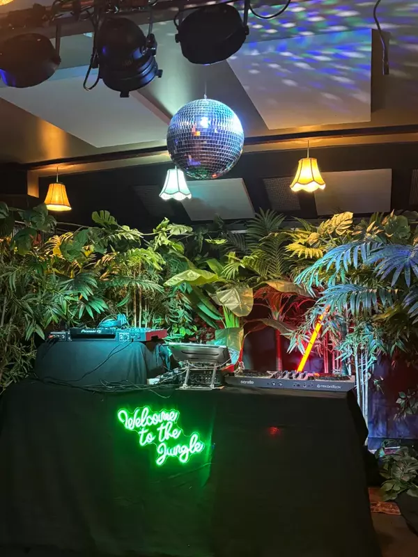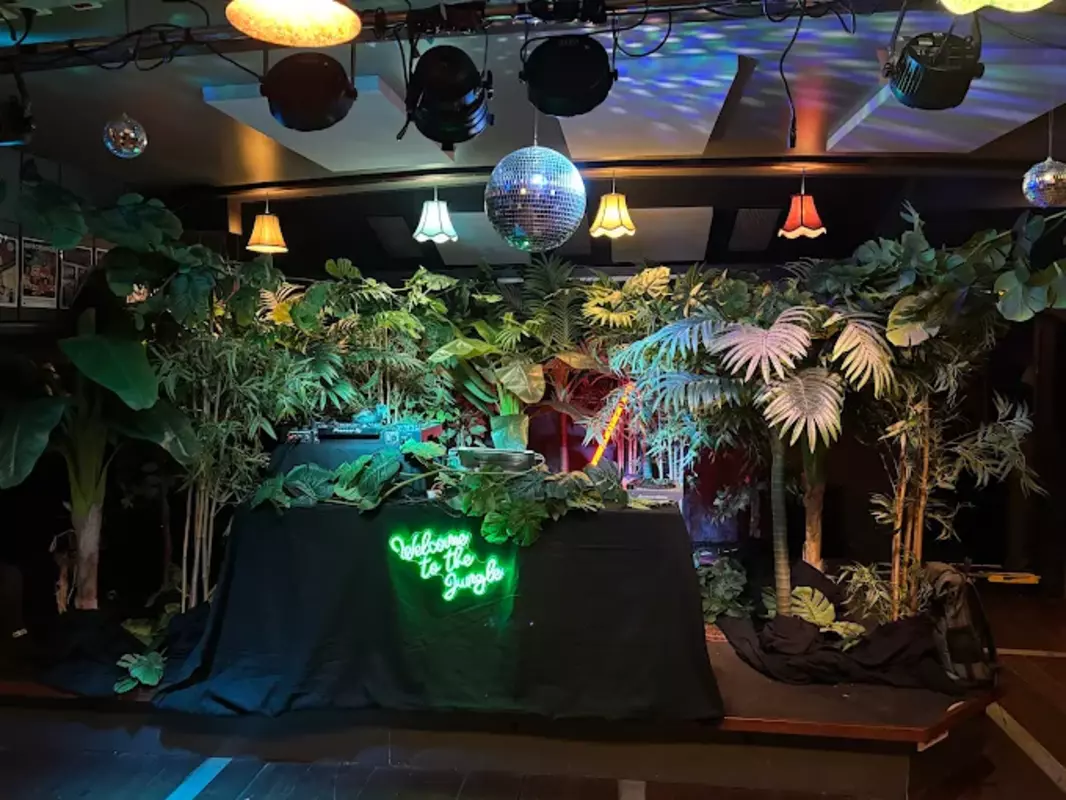 Chaque lumière glisse sur les feuilles, rebondit sur une boule à facettes, et vient danser au rythme du son. Le vert profond dialogue avec les tons dorés et violets, pour une ambiance à la fois mystique et explosive.