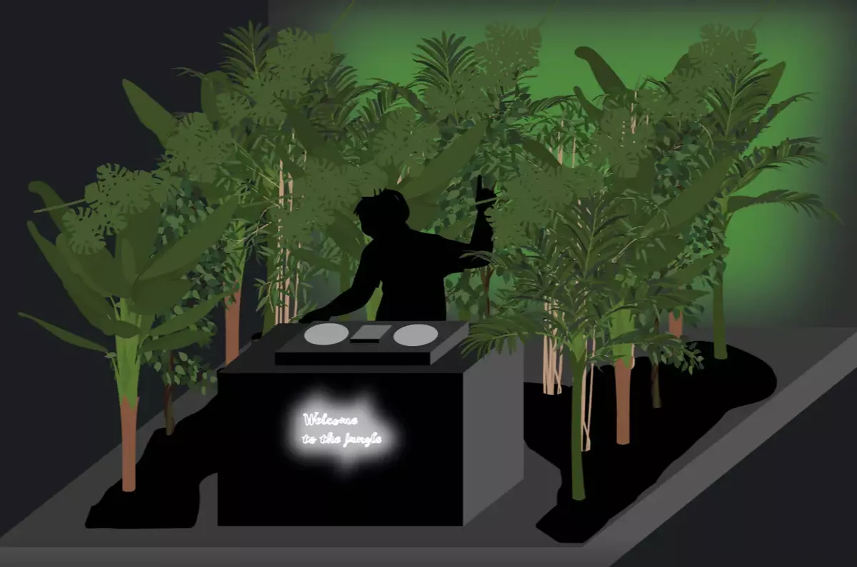 Au centre, une scène végétalisée envahie de feuillages, de palmiers et de plantes suspendues. Les textures naturelles s’entrelacent avec des reflets métalliques et des jeux de miroirs, évoquant la dualité entre nature brute et fête urbaine.