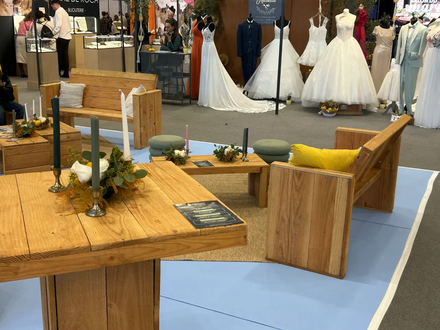 C’était un réel plaisir de collaborer à vos côtés sur le salon du mariage de Vannes. Le mobilier en bois a parfaitement trouvé sa place et a largement contribué à créer une ambiance chaleureuse et élégante sur l’espace détente comme à l’accueil tout en répondant au thème du salon.
